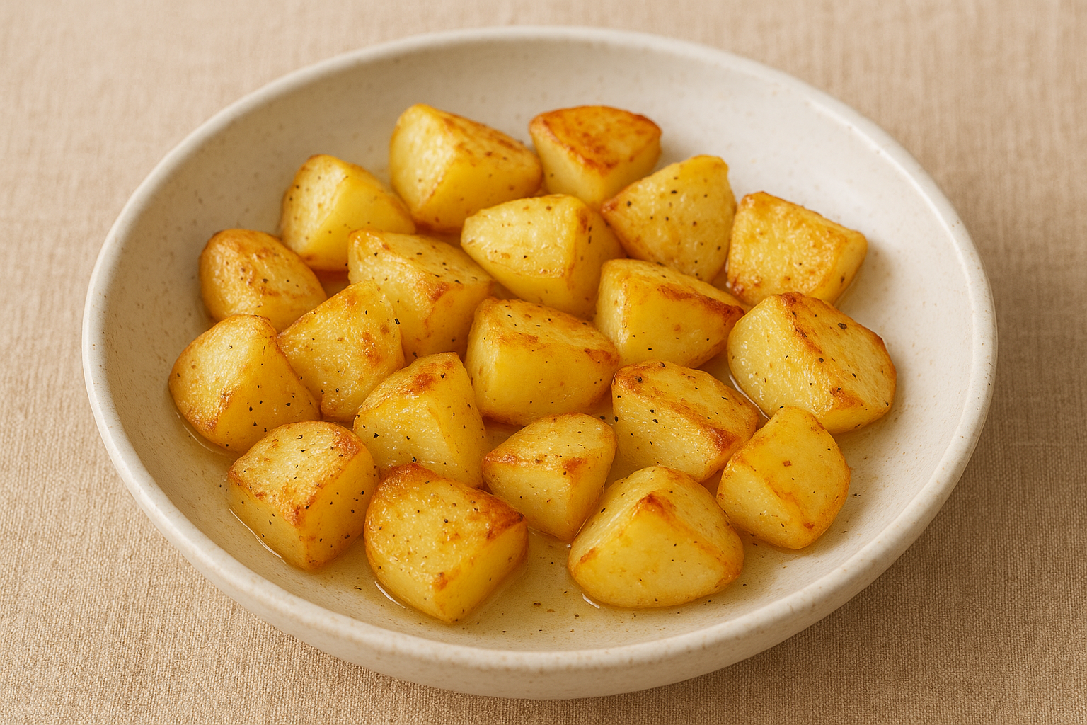 電子レンジで軽く下ゆで(600Wで3分) - フライパンでバターを熱し、じゃがいもを両面こんがり焼く。